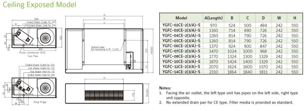 Холодопроизводительность фанкойлов YGFC от 1 до 13 кВт (при стандартных условиях и внешнем статическом давлении 30 Па для серии H и 50 Па для серии U). Расход воздуха от 340 да 2.595 м?/час. . Основные преимущества Высокая эффективность и надежность Высокоэффективный теплообменник выполнен из медной трубки с алюминиевым оребрением. Максимальное рабочее давления составляет 16 бар. Данное значение позволяет использовать эти фанкойлы в высотных зданиях (до 150 м). Фильтр из полипропиленовой ячеистой ткани защищает теплообменник и вентилятор от попадания пыли. Центробежные вентиляторы выполнены из оцинкованной стали с рабочими колесами с вперед загнутыми лопатками. Все вентиляторы отбалансированы и протестированы. Асинхронные моторы вентиляторов имеют три скорости вращения. Электроподключения вынесены в клеммную коробку на корпусе фанкойла. Простая конструкция и надежность всех элементов позволяет минимизировать затраты на обслуживание фэн-койлов. Самосмазывающиеся шарикоподшипники снижают уровень шума и продлевают срок службы вентиляторов. Их поверхность также обработана антикоррозийным материалом, чтобы продлить срок службы вала двигателя. Фанкойлы могут поставляться в комплекте с 2-х или 3- х ходовыми клапанами по воде. Клапаны могут быть укомплектованы с приводами On/Off или плавным регулированием. Фанкойлы могут поставляться в комплекте с проводными настенными термостатами. Обычно используются на коммерческих, промышленных и инженерных сооружениях. Способны контролировать скорости вентилятора и клапана охлаждения. Фанкойлы серии YGFC имеют сертификат EUROVENT