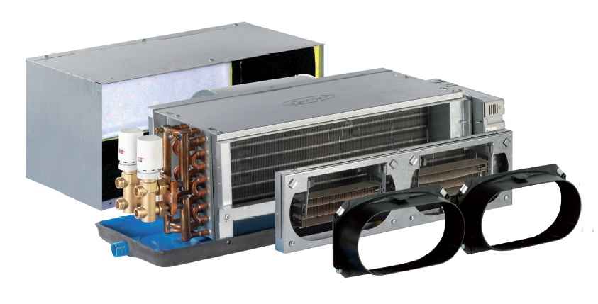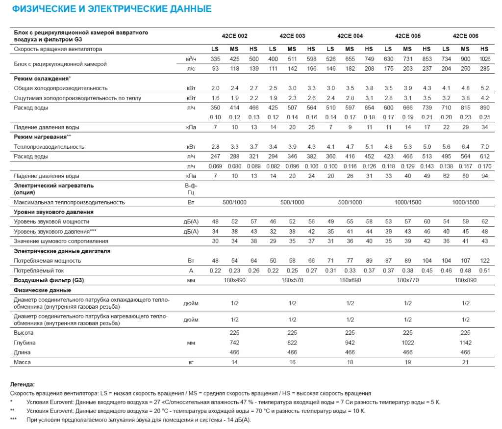 Основные характерные особенности: • Превосходная отделка • Отдельный изолированный поддон для конденсата с антикоррозионным внутренним покрытием • Отсутствие стандартного фильтра для расширения возможностей при установке. В качестве аксессуара поставляется фильтр G3. • Стандартный встроенный соединительный рукав • Трехскоростной вентиляторный электродвигатель • Теплообменник с устройствами выпуска воздуха и водяными патрубками, расстояние между центрами которых равно 40 мм • Низкое падение давления, совместимое с гидронными системами большинства жидкостных чиллеров Фанкойл 42СЕ может быть оборудован смесительной камерой возвратного воздуха, что позволяет устанавливать фильтр с эффективностью G3 (с гравиметрической характеристикой 85 %). Этот фильтр поставляется как аксессуар. Камера возвратного воздуха звукоизолирована и позволяет снизить уровень шума на -3 дБ(А). Фанкойл 42СЕ поставляется со смесительной камерой подаваемого воздуха с двумя или тремя удлиненными соединителями (в зависимости от типоразмера блока). Эти соединители имеют такой же периметр, как круглый канал диаметром 200 мм. Этот блок может быть на месте эксплуатации подключен к одному или нескольким коробам воздухораспределения с помощью гибких звукопоглощающих воздуховодов Для обеспечения достаточной теплопроизводительности фанкойл 42СЕ может быть оборудован электрическим резистивным подогревателем. • Электропитание: Однофазное напряжение 230 В, 50 Гц • Значения теплопроизводительности по типоразмерам блоков: - 42СЕ 002, 003, 004: 500 Вт или 1000 Вт (+5 %/-10 %) - 42СЕ 005, 006: 1000 Вт или 1500 Вт (+5 %/-10 %) • В подогревателе имеется два предохранительных устройства: - встроенное предохранительное термореле, не требующее технического обслуживания, на температуру выключения 75 0С. При достижении температуры выключения на резистивный подогреватель автоматически подается напряжение. Это исключает возможность автоматического включения, если в систему подается напряжение при отсутствии потока воздуха. Включение возможно только после отключения напряжения питания электрического подогревателя. Предохранительное термореле защищает блок от перегрева, возникающего в случае работы электрического подогревателя при отсутствии потока воздуха. - Плавкий предохранитель на срабатывание при температуре 167 0С. Изготовитель может по специальному заказу установить следующие клапаны холодной и горячей воды: • Двухходовые клапаны • Трехходовые клапаны С цифровыми контроллерами и электронными комнатными регуляторами производства компании Carrier используется двухпозиционный привод на 230 В переменного тока.